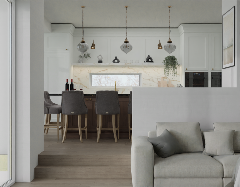 Comfortable Seating Area – Plush upholstered bar stools create a welcoming space for entertaining.