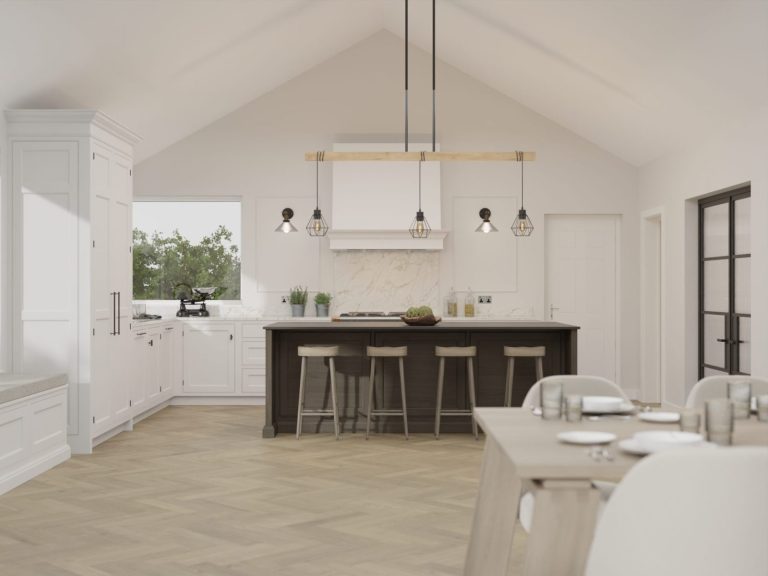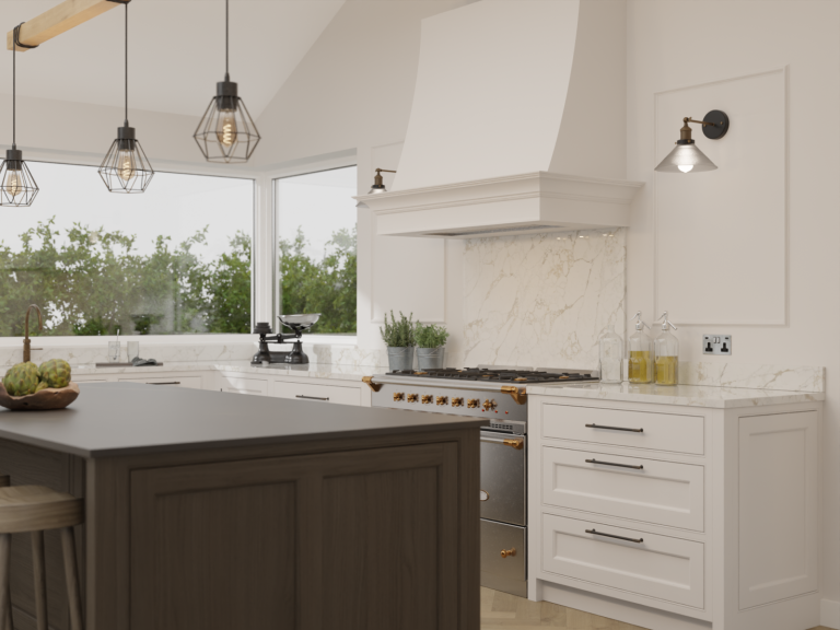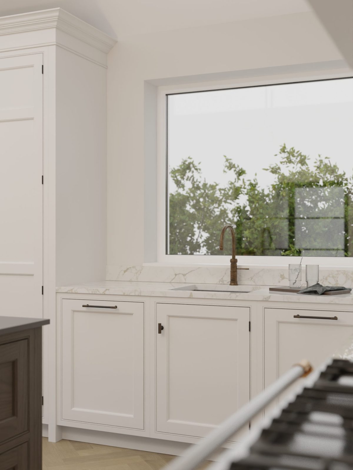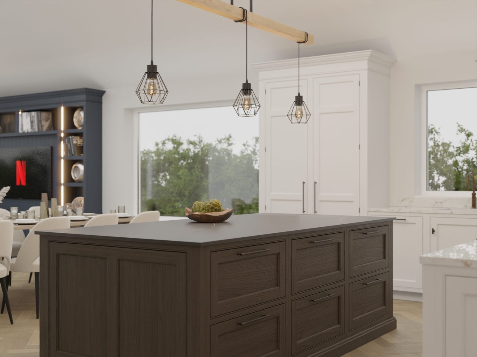 This stunning bespoke kitchen showcases timeless elegance meets modern functionality. Featuring a spacious open-plan layout, this kitchen blends natural wood tones, luxurious marble surfaces, and classic shaker-style inframe cabinetry to create a warm yet sophisticated atmosphere. The large central island, complete with ample storage and stylish bar stools, is perfect for entertaining and everyday use. Integrated appliances, a sleek gas cooktop, and a handcrafted range hood add both convenience and charm.