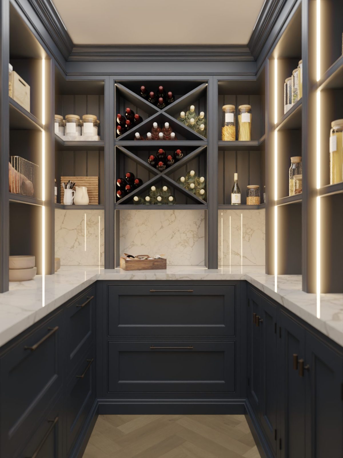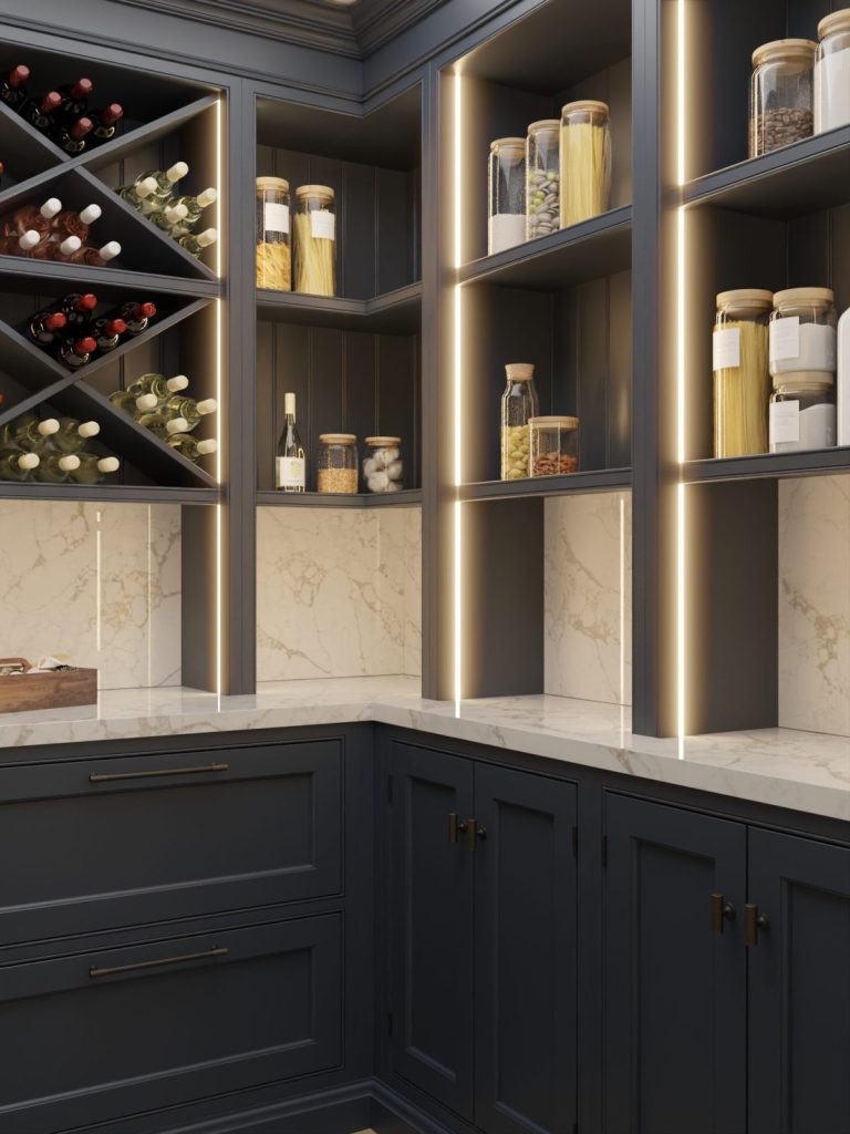 Adjacent to the kitchen, the beautifully organized pantry offers additional storage with open shelving and enclosed cabinetry, ensuring everything is neatly arranged and within reach.