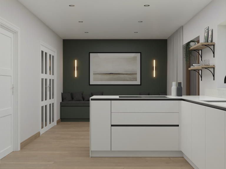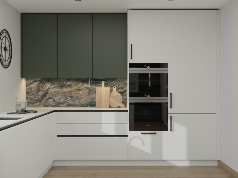 Two-Tone Cabinetry – A sophisticated mix of white and deep green adds depth and character to the space.