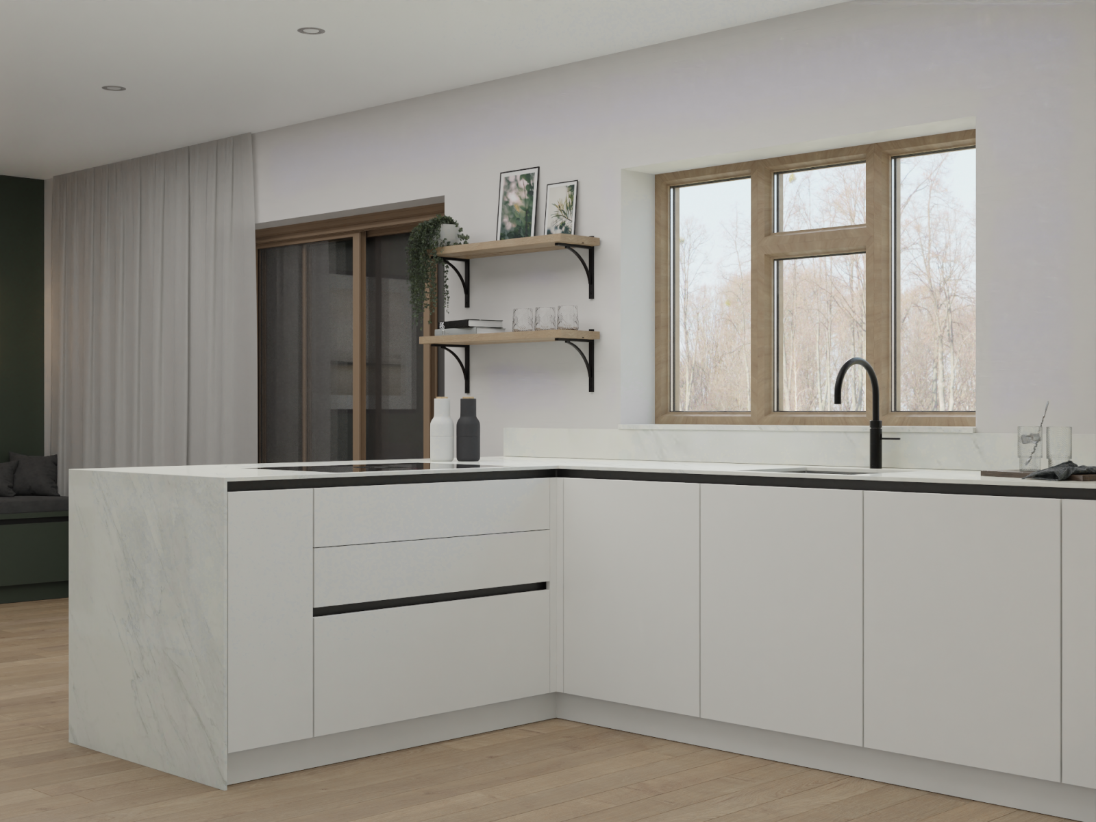Open Shelving & Natural Light – Warm wooden shelves and large windows enhance the airy, organic feel.